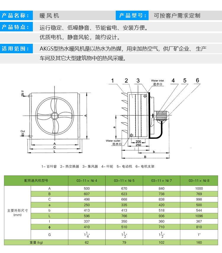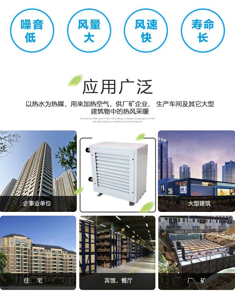 暖风机是由通风机、电动机及空气加热器组合而成的联合机组。适用于各种类型的车间,当空气中不含灰尘和易燃或易爆性的气体时,可作为循环空气供暖用。暖风机可独立作为供暖用,一般用以补充散热器的不足部分或者利用散热器作为值班供暖,其余热负荷由暖风机承担。