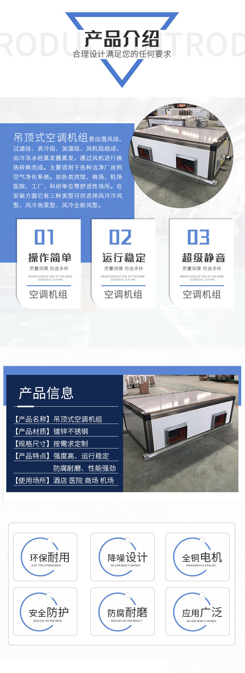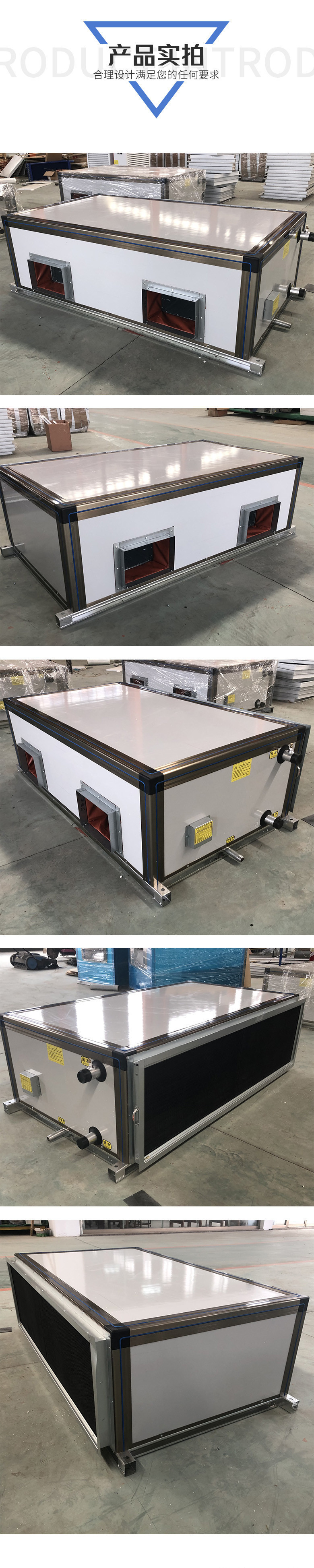 吊顶式空调机组,它是由混风段、过滤段、表冷段、加湿段、风机段组成,由冷冻水经蒸发器蒸发,通过风机进行换热转换而成。