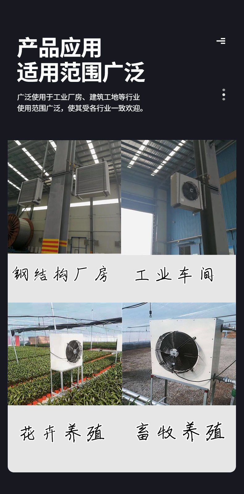 暖风机是一种通过各种热煤(热水、蒸汽、电)作为介质的暖通末端装置,能迅速冷却和加热室内空气或室外新风,增强空气循环。是国内比较先进的设备,可广泛应用在工矿企业的生产车间和大型公共建筑内。可根据需要安装在侧面或安装在顶棚。