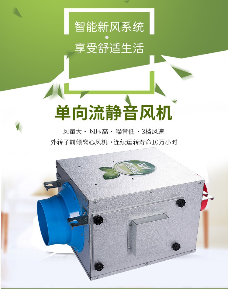 单向流系统是基于机械式通风系统三大原则的中央机械式排风与自然进风结合而形成的多元化通风系统,由风机、进风口、排风口及各种管道和接头组成的。安装在吊顶内的风机通过管道与一系列的排风口相连,风机启动,室内混浊的空气经安装在室内的吸风口通过风机排出室外,在室内形成几个有效的负压区,室内空气持续不断的向负压区流动并排出室外,室外新鲜空气由安装在窗框上方(窗框与墙体之间)的进风口不断的向室内补充,从而一直呼吸到高品质的新鲜空气。该新风系统的送风系统,但无须送风管道的连接,而排风管道一般安装于过道、卫生间等通常有吊顶的地方,基本上不额外占用空间。